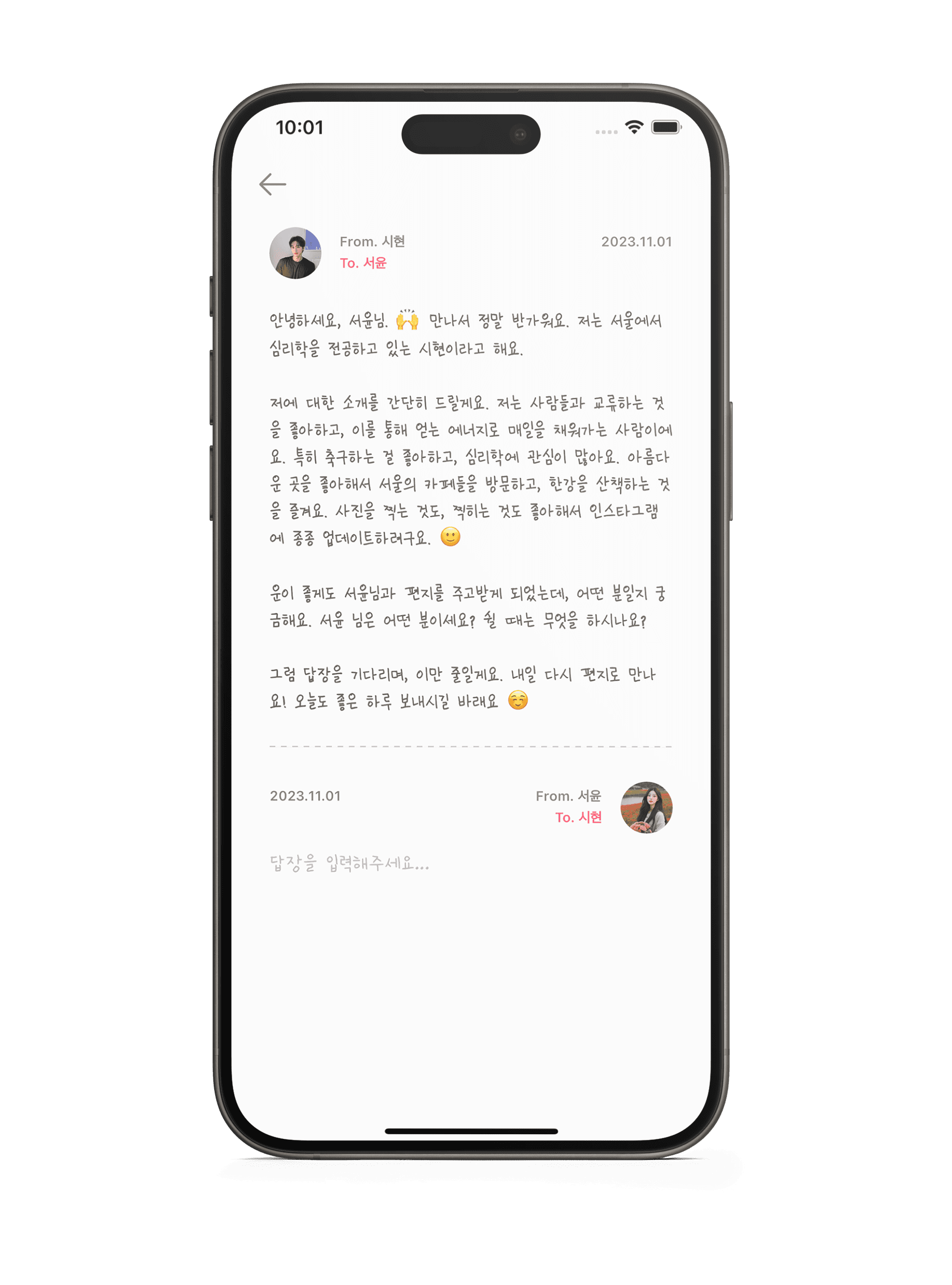 안녕하세요, 편지 주고받자는 제안 받아주셔서 감사해요 ☺️